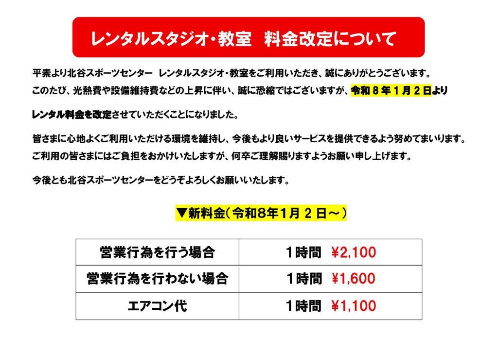 レンタルスペース料金改定について