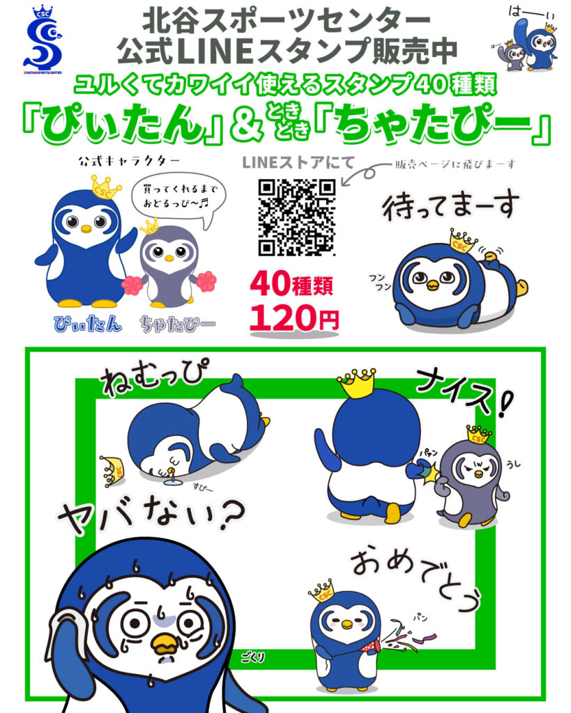 ✨『ぴぃたん」&ときどき『ちゃたぴー』✨\ユルくてカワイイ使えるスタンプ /40種類が120円で購入できます🐧北谷スポーツセンターの大人気キャラクター『ぴいたん』&『ちゃたぴー』があなたのトークに💬笑ったり、泣いたり、ちょっとお惚けしたり…🤭ゆるくてカワイイ表情をぎゅっと詰め込んだスタンプができました👏🏻💕ぜひチェックして、今日から使ってみてください♪
