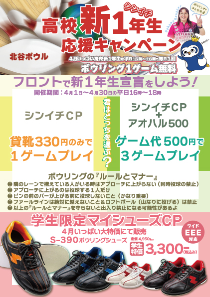 毎年恒例の✨\高校新1年生応援キャンペーン🎳/📅2026/4/1(水)〜4/30(木)まで【シンイチキャンペーン】フロントで「新1年生です!」と宣言するだけ!⏰平日16:00〜18:00👉毎日1ゲーム無料✨👟貸靴代¥330新しい友達との出会い、放課後にみんなでワイワイこれから始まる高校生活をもっと楽しくするきっかけに🎶“はじめまして”が自然に増える、そんなシンイチキャンペーンです🌸